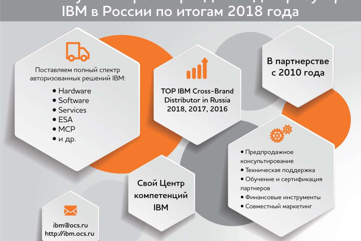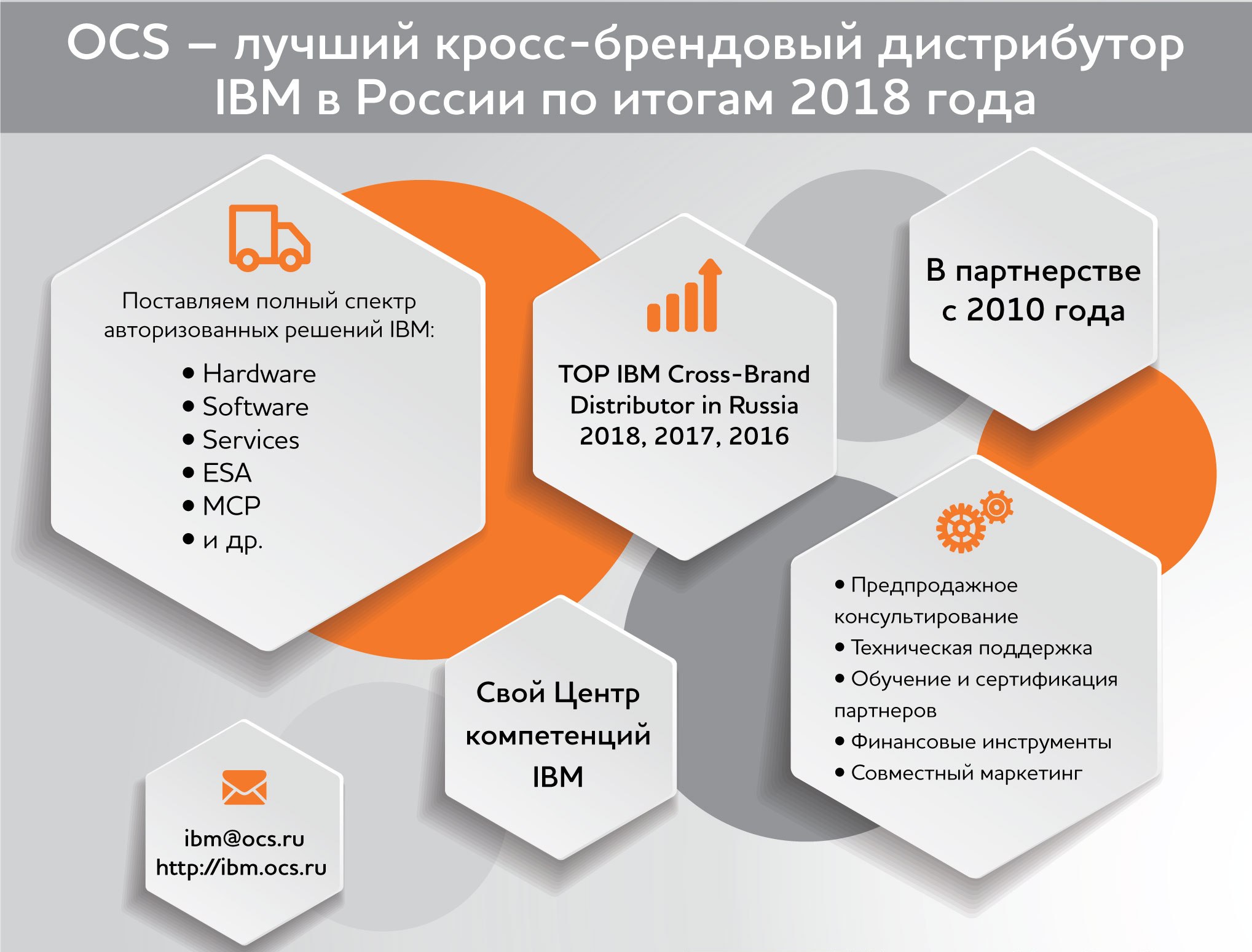 Компания OCS Distribution вновь признана лучшим кросс-брендовым дистрибьютором IBM в России (TOP Cross-Brand Distributor). Этим званием компания IBM отметила работу дистрибьютора в 2018 году по комплексным поставкам оборудования, программного обеспечения и сервисов IBM. Статус лучшего кросс-брендового дистрибьютора компания OCS получает уже третий год подряд.