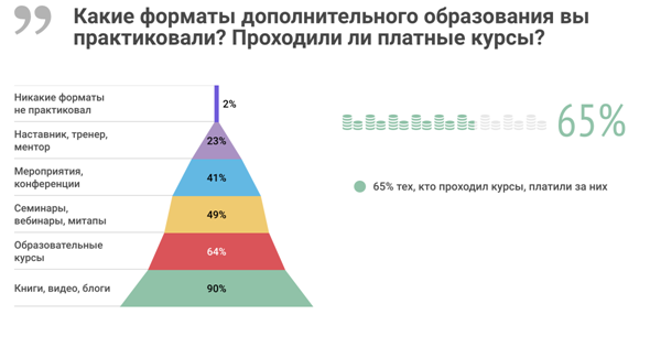 Рассмотрим подробнее дополнительное образование. Почти каждый «айтишник» занимается самообразованием с помощью книг, видео, блогов; двое из трёх проходят курсы дополнительного профобразования, каждый второй посещает митапы. Из тех, кто проходит курсы, 65% хотя бы раз платили за них.