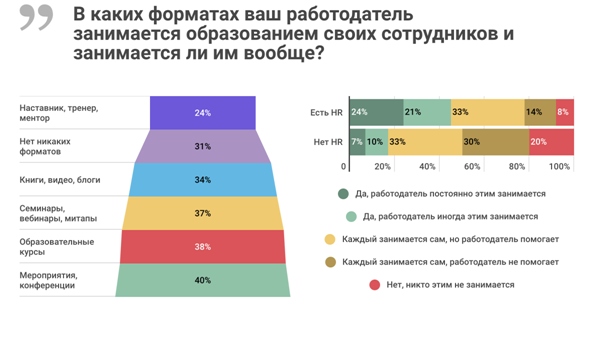 Компании, в которых есть HR-менеджер или HR-отдел, гораздо более чутко относятся к образованию своих сотрудников. Такие компании в 45% случаев сами проявляют инициативу по образованию своих сотрудников и только в 14% случаев вообще никак не помогают с образованием. Компании, в которых выделенной HR функции нет — только в 17% проявляют инициативу, и аж в 30% случаев никак не помогают.