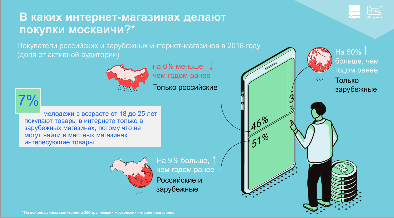 Интернет давно уже перестал претендовать на звание «цифровой глобальной деревни»: границы в нём определённо есть, и достаточно чёткие. Верно это утверждение и для отечественного онлайнового потребителя. Исследование ДИТ свидетельствует: 51% москвичей пользуются сегодня и российскими, и зарубежными Интернет-магазинами, 46% москвичей предпочитают только российские онлайн-площадки, и лишь 3% приобретают что-либо онлайн исключительно с доставкой из-за границы.