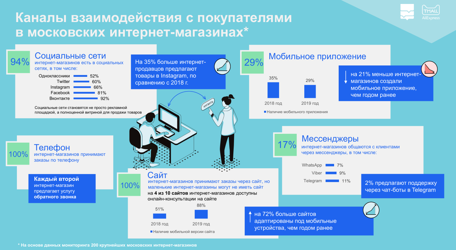 Аналитики ДИТ, произведя мониторинг двух сотен крупнейших московских Интернет-магазинов, свидетельствуют: социальные сети и мобильные устройства стали для них основным каналом продаж и общения с потребителем. Подавляющее большинство онлайновых торговцев, принимающих заказы у москвичей — 94%, — располагают коммуникационными площадками в социальных сетях: 92% — во «Вконтакте», 81% — в Facebook, 66% — в Instagram, 60% — в Twitter, 52% — в «Одноклассниках».