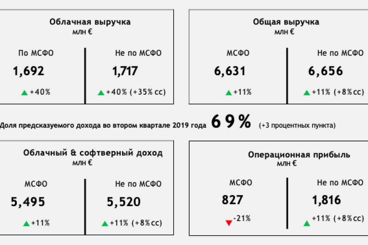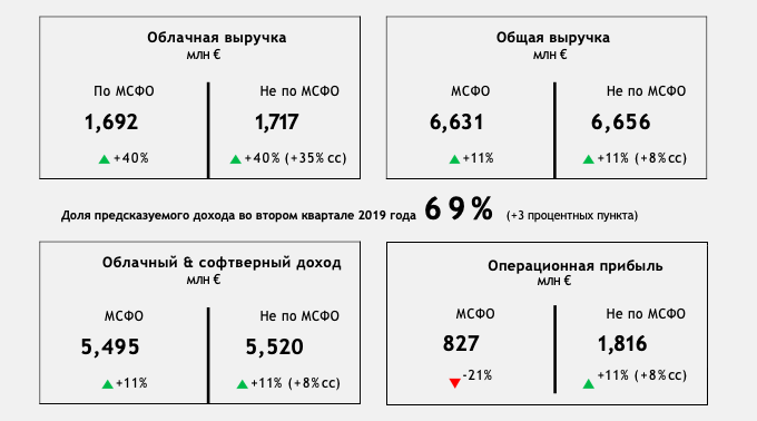 Двузначный рост был зафиксирован во всех ключевых направлениях бизнеса. Облачная выручка SAP во втором квартале 2019 года достигла 1,69 млрд евро (по МСФО) или 1,72 млрд евро (не по МСФО), что на 40% выше в сравнении с аналогичным периодом 2018 года. Валовая маржа облачного бизнеса увеличилась на 4%.