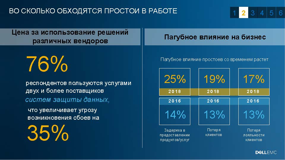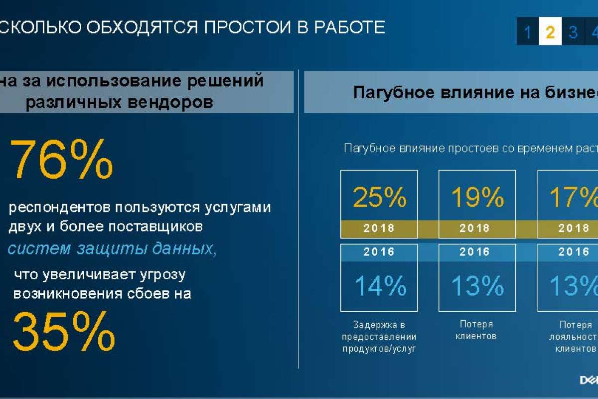 - За последние 12 месяцев 76% организаций столкнулись с перебоями, а 27% — с невосполнимой потерей данных, что почти вдвое превышает показатели 2016 года — 14%.