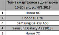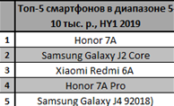 Самым популярным смартфоном в России по итогам первого полугодия 2019 года оказался Honor 7A, в топ-5 вошли ещё три модели Honor. В рейтинг также вошла одна модель от Xiaomi — Redmi 6A и Samsung — Galaxy J2 Core. В последние четыре года в январе-июне в пятёрку самых популярных смартфонов входили преимущественно модели Samsung или Apple.