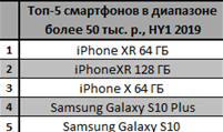 В первом полугодии активно рос спрос на смартфоны в трёх ценовых сегментах: от 5 до 10 тыс. руб., от 10 до 20 тыс. руб. (в совокупности занимают 70% рынка) и более 50 тыс. руб. Самыми продаваемыми устройствами в нижнем и среднем диапазонах стали Honor 7A и Honor 8X соответственно. Среди премиальных девайсов наибольшей популярностью пользовался iPhone XR 64 ГБ. (Рис.