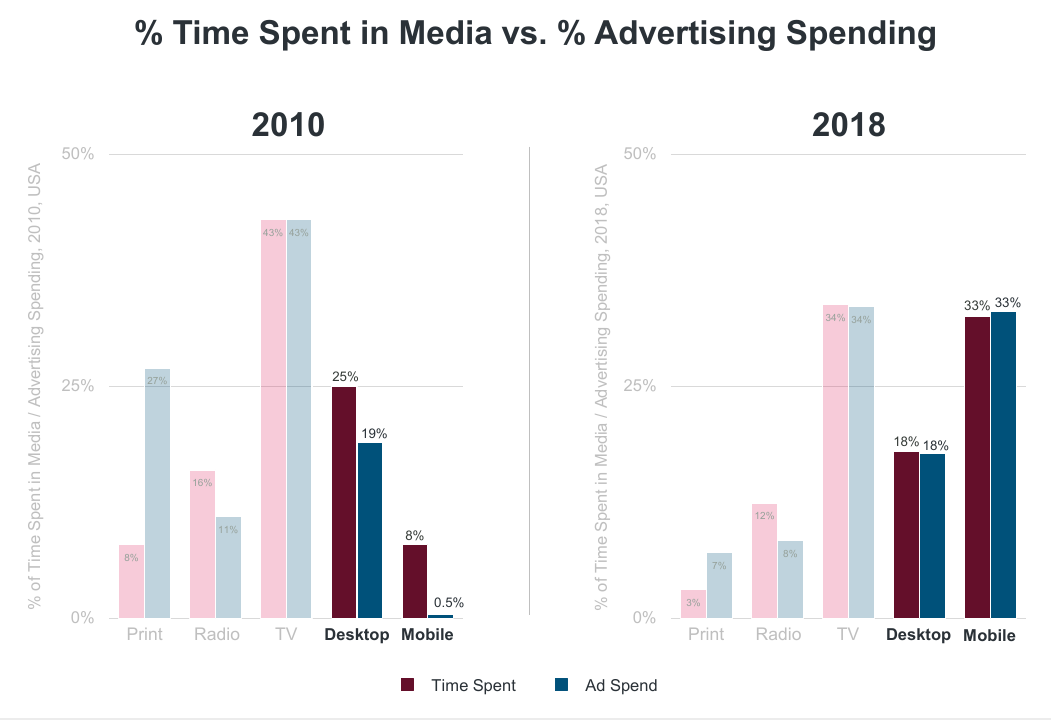 Доля e-commerce на американском рынке, наиболее передовом в плане финансовой мощи Интернет-сектора, по итогам 2019 г. подберётся вплотную к 16% от общего объёма розничных продаж — тогда как ещё в 2012 г. едва превышала 8%. Неуклонный рост этой доли сопровождается радикальными переменами в потребительском поведении и в выстраиваемых с его учётом каналах маркетинговых коммуникаций. К примеру, в США в 2010 г. пользователи отдавали ПК около 25% своего времени, мобильным гаджетам — лишь 8%. В то же время доля затрачиваемых бизнесом на рекламные кампании средств через компьютерный канал составляла 19%, а через мобильный — ничтожные 0,5%. В 2018 г. ситуация кардинальным образом изменилась: теперь перед мониторами ПК потребители проводят 18% времени, а со смартфонами в руках — 33%. И доли затрат бизнеса на рекламу по соответствующим каналам — точно такие же: 18 и 33% (рис. 2).