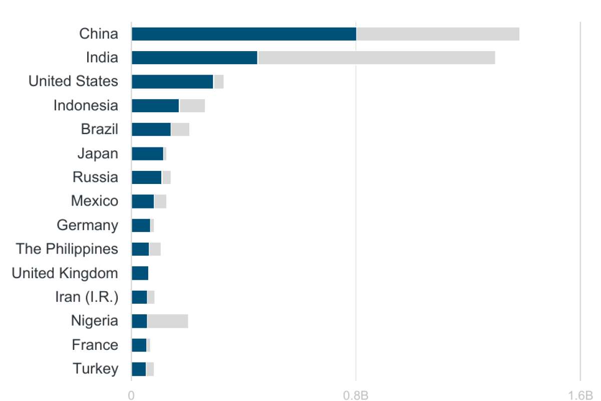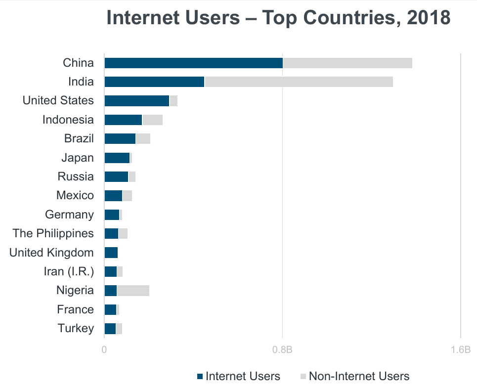 Именно в этой связи, отмечает Мэри Микер, особое значение для бизнеса приобретают большие данные и базирующаяся на них персонификация продаж товаров и оказания услуг. Размер Интернет-аудитории по-прежнему имеет значение: крупнее всего она в КНР (800 млн человек), на втором месте Индия, затем США, потом Индонезия, Бразилия, Япония и Россия (рис. 1). При этом уровень финансового развития рынков каждой из стран также играет немалую роль: из 30 имеющих отношение к Интернету глобальных компаний с наивысшей капитализацией 18 зарегистрированы в США (Microsoft, Amazon, Apple, Alphabet и т. д.) и только 7 — в Китае.