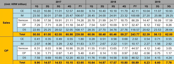 Квартальная операционная прибыль составила 7,78 трлн вон, общий объём продаж 62 трлн вон. Основными источниками прибыли в третьем квартале стали флагманские модели смартфонов и матрицы OLED, кроме того, в 2020 году ожидается восстановление рынка элементов памяти.