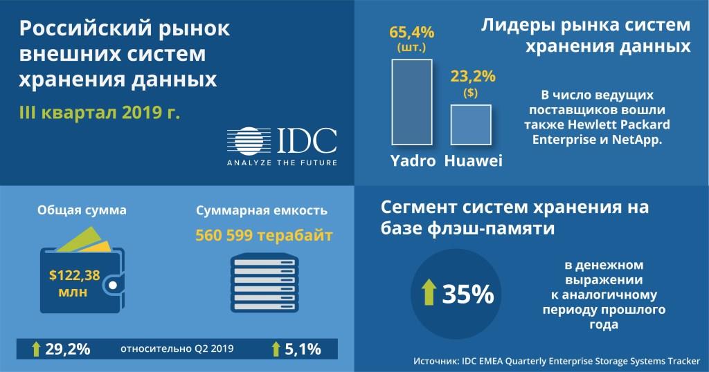 По результатам исследования IDC EMEA Quarterly Enterprise Storage Systems Tracker, в третьем квартале 2019 года на российский рынок было поставлено внешних систем хранения данных на общую сумму 122,38 млн долларов США суммарной ёмкостью 560 599 терабайт.