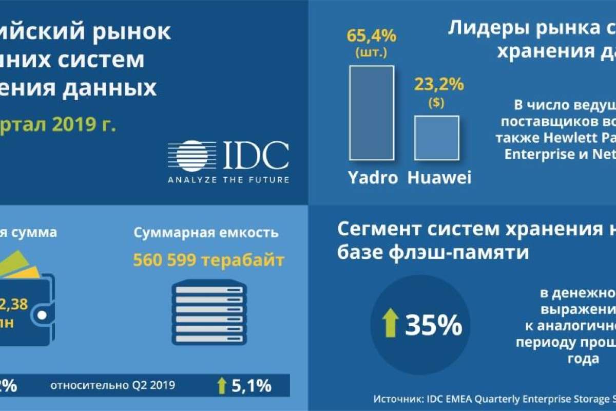 По результатам квартала, лидерами рынка внешних систем хранения данных стали компания Huawei с долей в денежном выражении в 23,2% и компания Yadro с долей в ёмкостном выражении в 65,4%. В число ведущих поставщиков вошли также компании Hewlett Packard Enterprise и NetApp. Компания Yadro продемонстрировала наибольший темп роста поставок как в денежном, так и ёмкостном выражении по сравнению с аналогичным периодом прошлого года. IBM, Huawei и Lenovo также показали уверенный рост поставок в денежном и ёмкостном выражении. В поставках систем на базе флэш-памяти лидируют Huawei, HPE и NetApp.