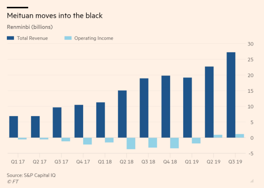 На начальных этапах развития Meituan Dianping комиссии и плата за продвижение были, разумеется, ниже, да и конечные пользователи приложения непрерывно получали самые щедрые скидки. Именно этим объясняются длительные операционные убытки агрегатора: не набрав достаточно масштабных баз поставщиков и потребителей, подобному предприятию невозможно привлечь к себе внимание иначе как откровенным демпингом. Зато теперь, когда компания оперирует более чем в 2800 населённых пунктах КНР и опирается на