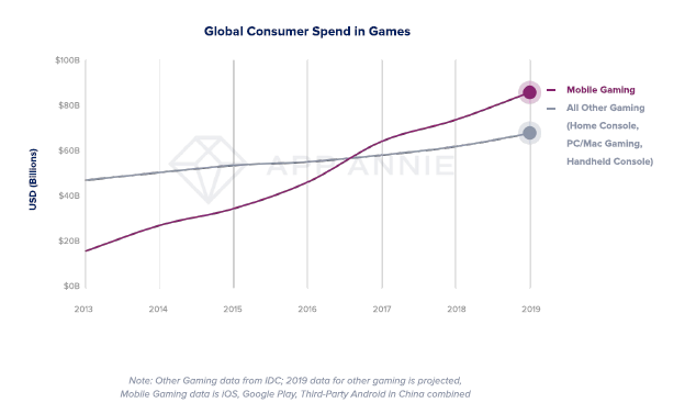 - Мобильные игры в 2019 — самые популярные игры на планете. На игры приходится 72% трат пользователей среди всех мобильных приложений — 86 млрд долл., и к 2020 году эта цифра превысит 100 млрд долл. В целом в 2019 году на мобильные игры пользователи потратили на 25% больше, чем на все остальные виды игр вместе взятые.