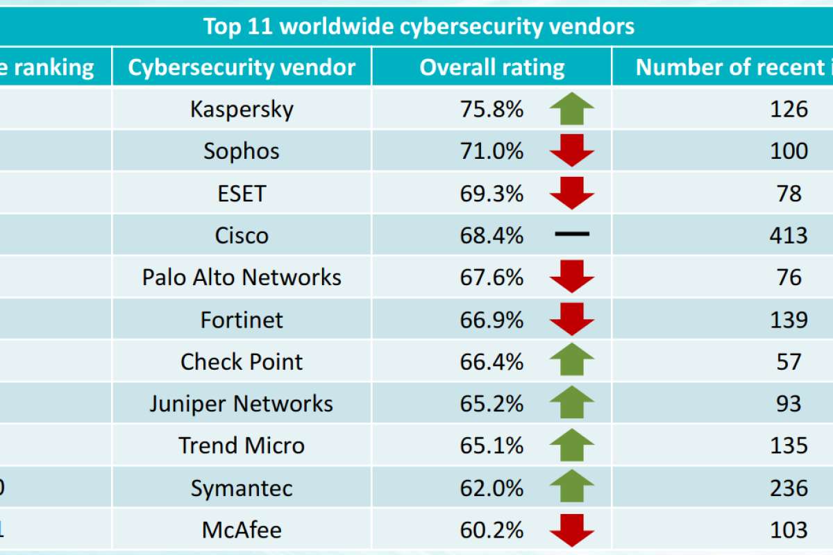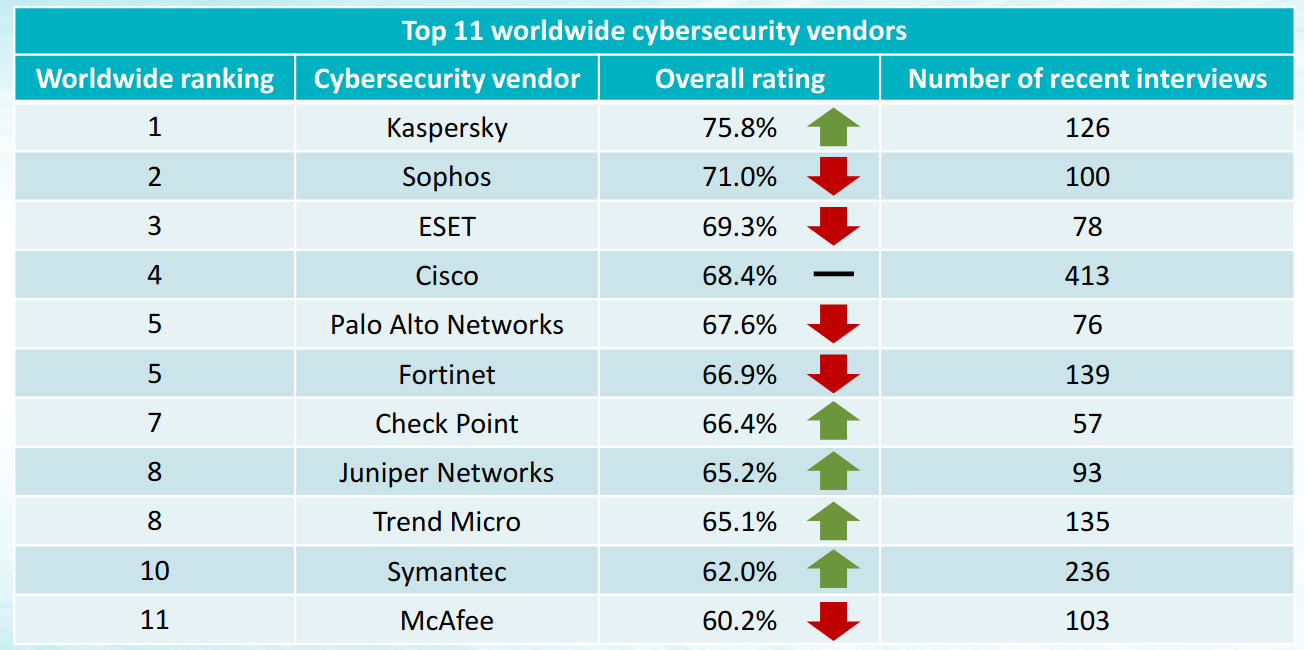 Очередная независимая комплексная оценка решений в области кибербезопасности — Canalys Worldwide Vendor Benchmark — вывела на первое место по уровню удовлетворённости партнёров в канале поставок «Лабораторию Касперского». Компания опередила в этом зачёте занявшие второе и третье места соответственно Sophos и ESET, а также 8 остальных фигурировавших в исследовании вендоров. Кроме того, по целому ряду категорий экспертной оценки российский разработчик весьма ощутимо упрочил свои позиции; в среднем — на 7,7% за год.