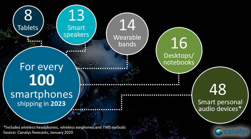Что же касается сегмента с самыми быстрыми темпами среднегодового прироста, то им станет, по мнению экспертов Canalys, умное персональное аудио. Поставки разнообразных наушников со встроенными цифровыми помощниками, в форм-факторе TWS или же с привычным соединительным проводком/ободом между динамиками, уже по итогам текущего года продемонстрируют CAGR на уровне 32,1% и достигнут 490 млн единиц. Второй по скорости роста сегмент — умные стационарные колонки: их в мире за 2020 г. должно быть отгружено 150 млн единиц, на 21,7% больше, чем в