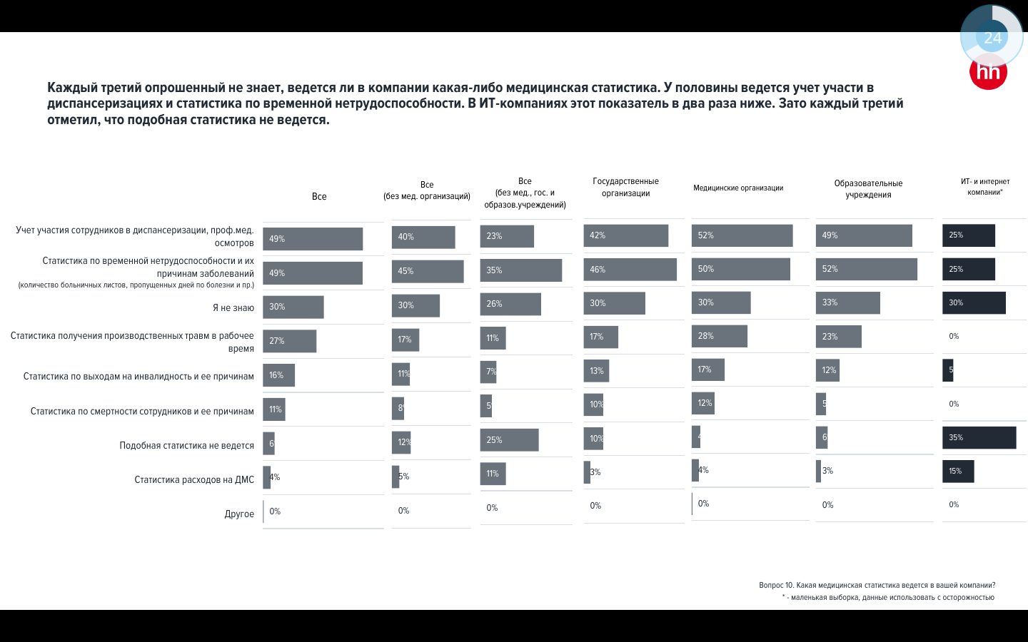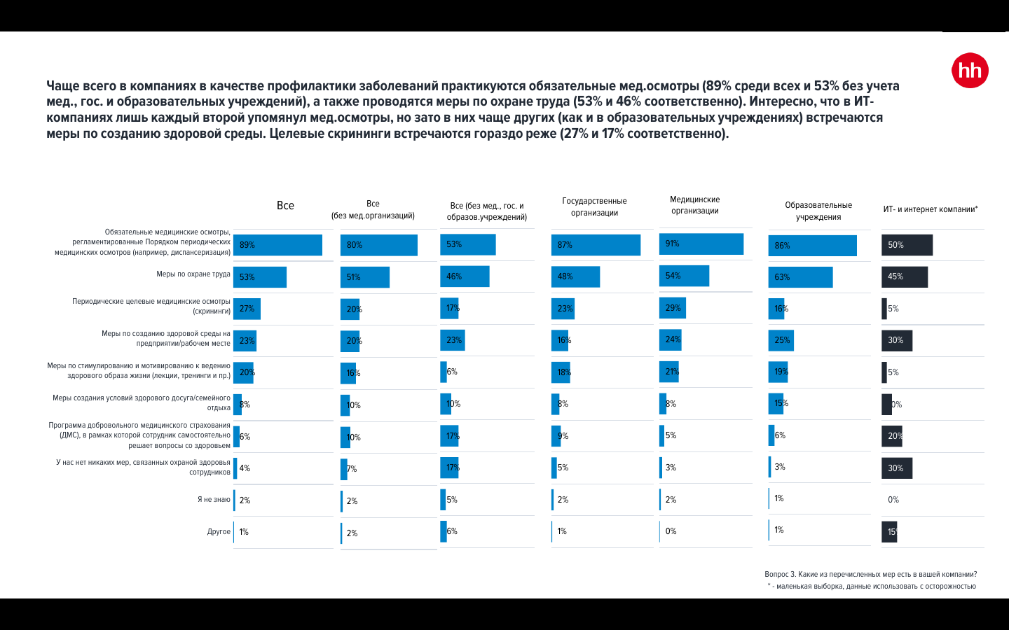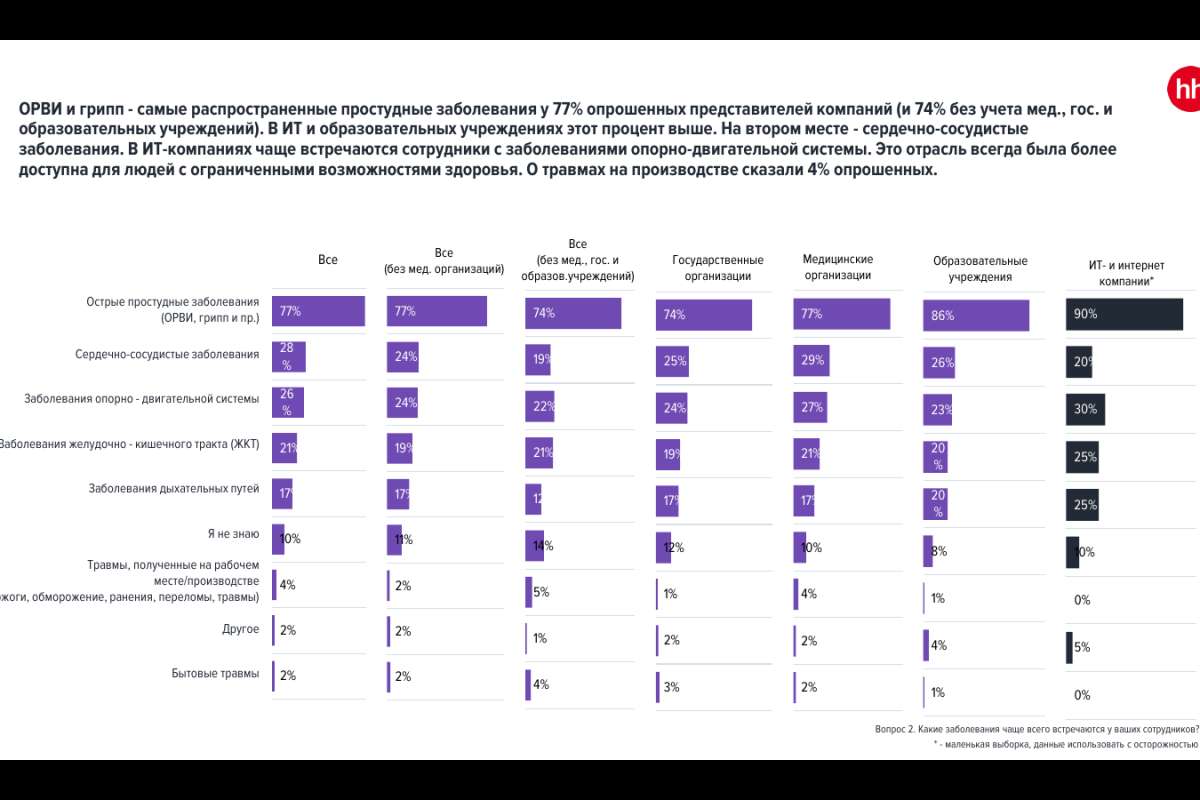 Служба исследований hh.ru подготовила для Министерства здравоохранения РФ доклад, содержащий оценку программ охраны здоровья сотрудников в российских компаниях. Документ был создан по итогам онлайн-опроса, проведённого среди 2,7 тыс. представителей российских компаний в период с