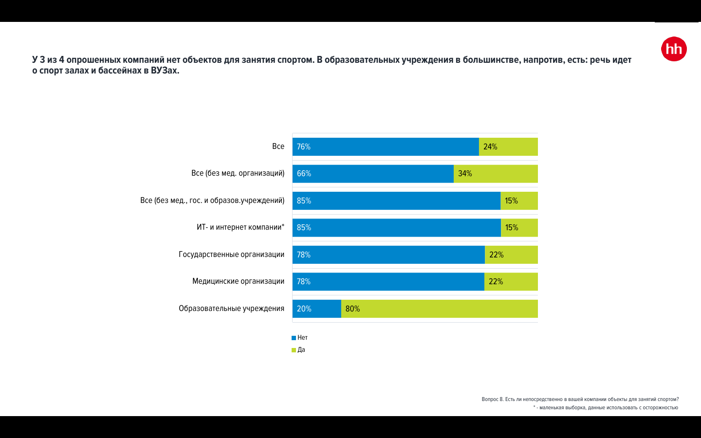 Объекты для занятий спортом в среднем имеются по данным опроса лишь на 24% российских предприятий (безусловный лидер тут — образовательные учреждения с 80%), а в ИТ- и Интернет-компаниях такие объекты встречаются ещё реже, — в 15% случаев. Интересно, что из этих 15% две трети составляют залы для игровых видов спорта, и одну треть — тренажёрные залы. Айтишники, похоже, до сих пор — ещё с советских времён — предпочитают настольный теннис. Если рассматривать наличие объектов для занятий спортом в зависимости от размеров компании, то приоритет здесь ожидаемо остаётся за крупными учреждениями: порядка 86% компаний с численностью до 10 человек сказали, что у них никаких спортивных объектов, а вот в компаниях с численностью более 1009 человек таких всего 60%.