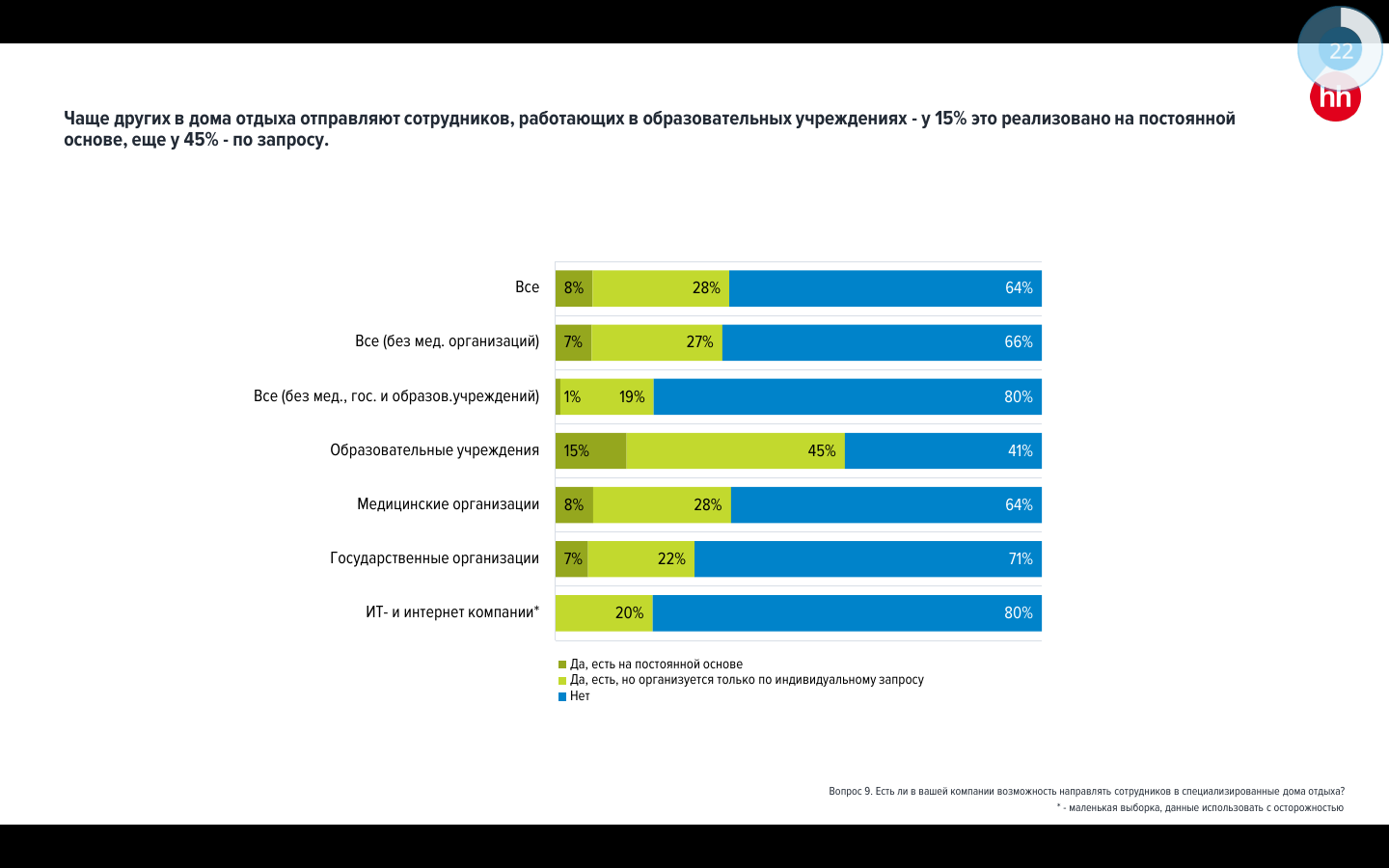 Сотрудники ИТ- и Интернет-компаний — единственные в рамках рассматриваемого отчёта, кого вообще не направляют в дома отдыха на постоянной основе (0% против 8% в среднем). В диспансеризациях, проф- и медосмотрах принимают участие лишь 25% сотрудников высокотехнологичных компаний (в среднем — 49%). Эксперты hh.ru приходят к выводу, что чаще всего российские компании — вне зависимости от их отраслевого профиля — согласны с тем, что на предприятиях должны быть разработаны и внедрены корпоративные программы охраны здоровья; что предприятие должно предпринимать действия и вкладывать средства для повышения информированности работников о мерах сохранения здоровья, об актуальных факторах риска (привет, COVID-19!), о мерах по снижению риска заболеваний и травм. Сотрудники же ИТ-компаний чаще других считают, кстати, что существующие запретительные меры по охране здоровья и воздействия табачного дыма и алкоголя не слишком эффективны. Почти с тем же скепсисом они оценивают и эффективность диспансеризаций.