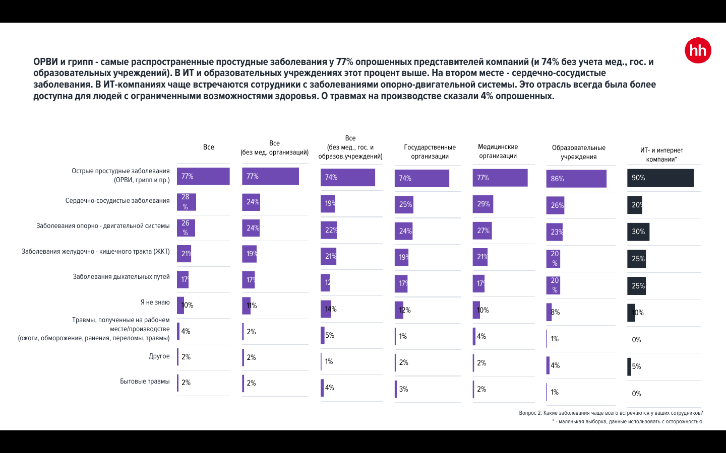Выяснилось, что ОРВИ и грипп — самые распространённые заболевания, встречающиеся у 77% опрошенных представителей всех компаний (для ИТ- и Интернет-компаний этот показатель ещё выше, — 90%). На втором месте с огромным отрывом — сердечно-сосудистые заболевания: 28% среди сотрудников всех компаний, но только 20% среди представителей ИТ- и Интернет-бизнеса. Зато в имеющих отношение к высоким технологиям компаниях чаще встречаются сотрудники с заболеваниями опорно-двигательной системы (30% против 26% для всех опрошенных), желудочно-кишечного тракта (25% против 21%) и дыхательных путей (25% против 17%).