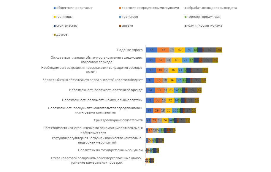 Считают вероятным срыв обязательств по выплате налогов в бюджет более 30% компаний сферы услуг (кроме туризма), гостиниц, торговли непродовольственными группами, общественного питания, и более 20% представителей транспортных предприятий.