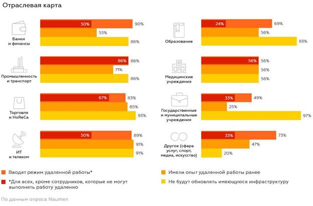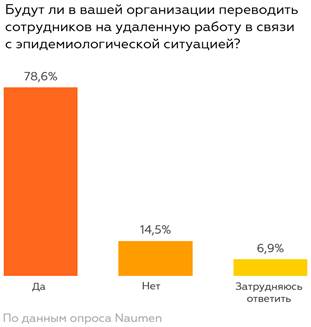 Компания NAUMEN опросила ИТ-специалистов российских организаций о готовности перевести сотрудников на удаленную работу в период пандемии COVID-19. Более 78% опрошенных сообщили, что их компании предоставляют персоналу удаленный доступ на период домашней изоляции и нерабочего месяца, при этом имеющейся информационной инфраструктуры достаточно. Однако лишь в 24% предприятий готовы перевести на домашний офис весь штат сотрудников.