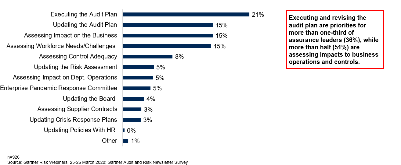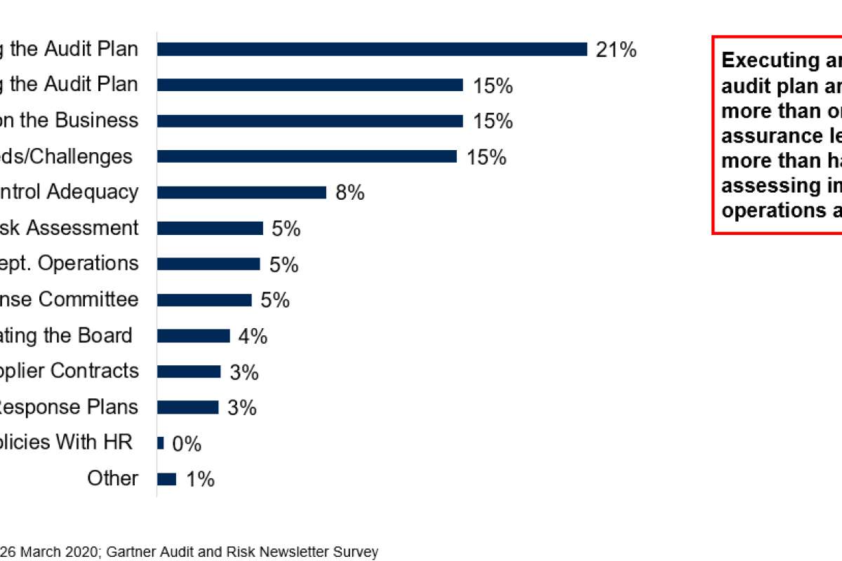 Опрос более 900 руководителей внутреннего аудита и управления рисками, проведенный аналитиками Gartner 27 марта, показал, что их внимание нацелено главным образом на оценку влияния пандемии коронавируса на операционную деятельность организации и средства контроля, а также на пересмотр плана аудита и проведение внутреннего аудита в компании. Лишь 4% респондентов ответили, что информирование Правления является их главной задачей на данный момент, тогда как 21% сообщили, что главным является проведение аудита (см. рис. 1).