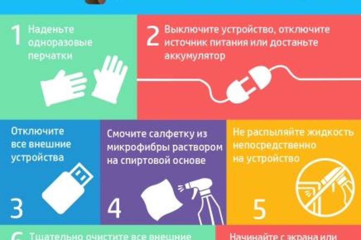 Опираясь на разработки Центров по контролю и профилактике заболеваний (CDC) , НP советует сначала тщательно очистить поверхности устройств, а затем провести дезинфекцию для профилактики вирусных респираторных заболеваний. Рекомендуется использовать дезинфицирующие средства на основе изопропилового спирта. Многие обычные бытовые чистящие средства могут повредить электронные продукты и вызвать неисправности. При этом не рекомендуется использовать растворы, содержащие отбеливатель, пероксиды (в том числе перекись водорода), ацетон, аммиак, этиловый спирт, метиленхлорид или любые составы, производимые из нефти.