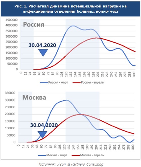 С учетом знания динамики серьезно больных (без учета бессимптомных) и среднего времени лечения была оценена потенциальная ежедневная загрузка койко-мест в медучреждениях страны и города Москвы. В целом, несмотря на улучшение апрельского прогноза, потенциальная нагрузка на больничный фонд в пике эпидемии может оказаться запредельной: для России в целом — 3 млн койко-мест, для Москвы — 200 тыс. койко-мест.