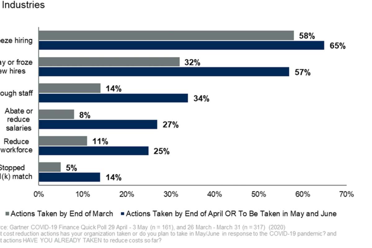 Блиц-опрос более 160 финансовых директоров, проведенный аналитиками Gartner 3 мая 2020 года, показал, что в мае-июне число компаний, отправляющих сотрудников в неоплачиваемый отпуск, а также вводящих снижение зарплат и сокращающих численность персонала, более чем удвоится по сравнению с концом марта. В марте персонал сократили 11% респондентов, а в мае-июне это планируют сделать 25% (см. диагр.).