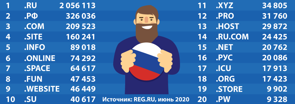Первые пять позиций в списке, как и год назад, занимают .RU, .РФ, .COM, .SITE и .INFO. Однако последние два домена поменялись местами, .SITE вырос практически на 100 тысяч адресов. При этом предпочтения россиян совпадают с глобальными трендами: .COM, .SITE, .INFO — одни из самых популярных в мире.