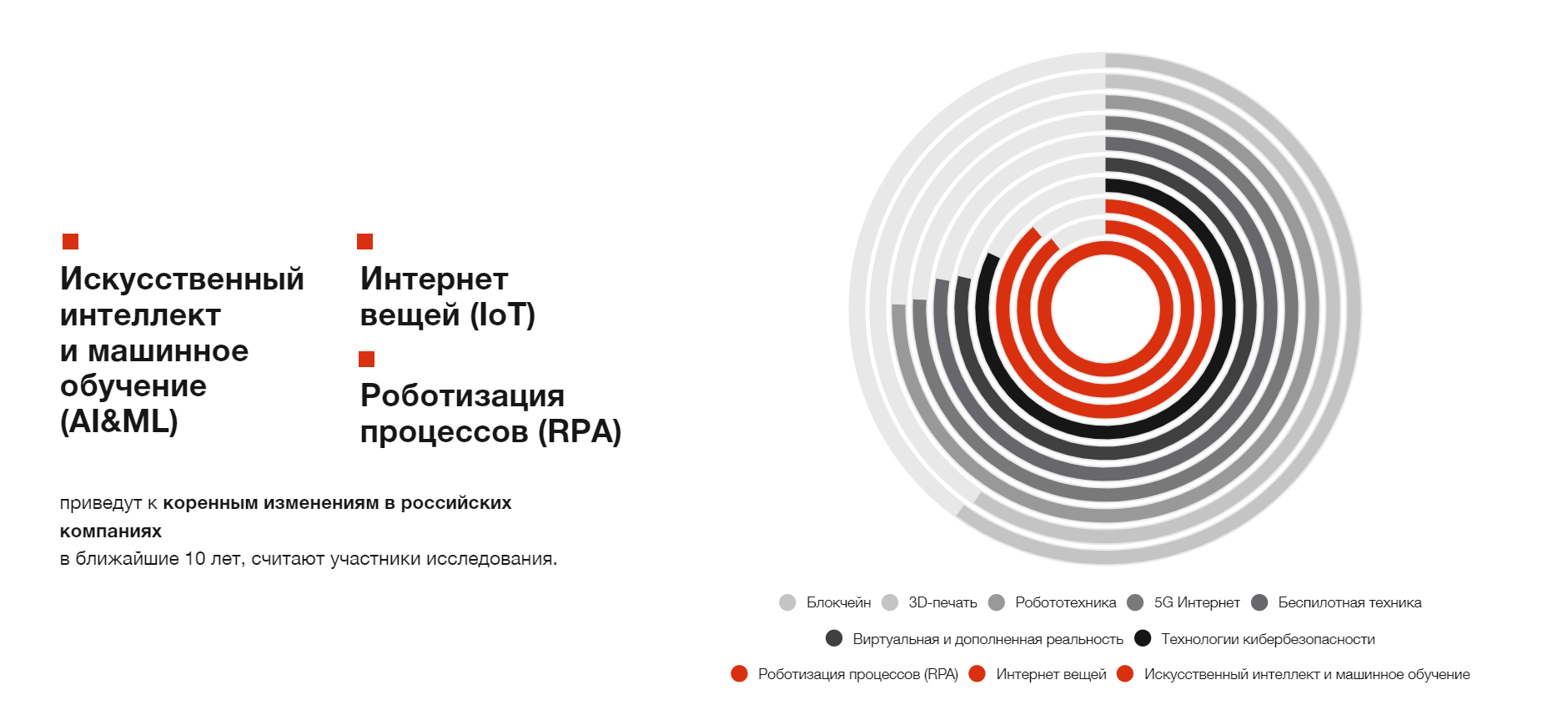 Алексей Окишев, партнер, руководитель технологической практики, PwC в России, отметил: «Результаты исследования наглядно демонстрируют, насколько глубоко современные инновационные решения интегрированы не только в нашу жизнь и бизнес-процессы, но и в ожидания людей от будущего. Любые прогнозы в перспективе 10 лет теперь едва ли можно назвать футуристичными, учитывая скорость, с которой изменяется реальность вокруг нас. Подавляющее число респондентов в вопросе о технологическом решении с наибольшим потенциалом влияния на бизнес отметили искусственный интеллект и машинное обучение, оценив их потенциал почти в 4,5 из 5 баллов. Здесь важно отметить не только развитие самой технологии, но и спектра сценариев ее применения в разных отраслях экономики, направлениях деятельности и даже отдельных задачах. Большое влияние на экономику, бизнес и жизнь, по мнению респондентов, также оказывает Интернет вещей (IoT). Потенциал именно этой технологии наши респонденты оценили в 3,9 балла, совсем не намного выше, чем Роботизацию процессов (PRA)».