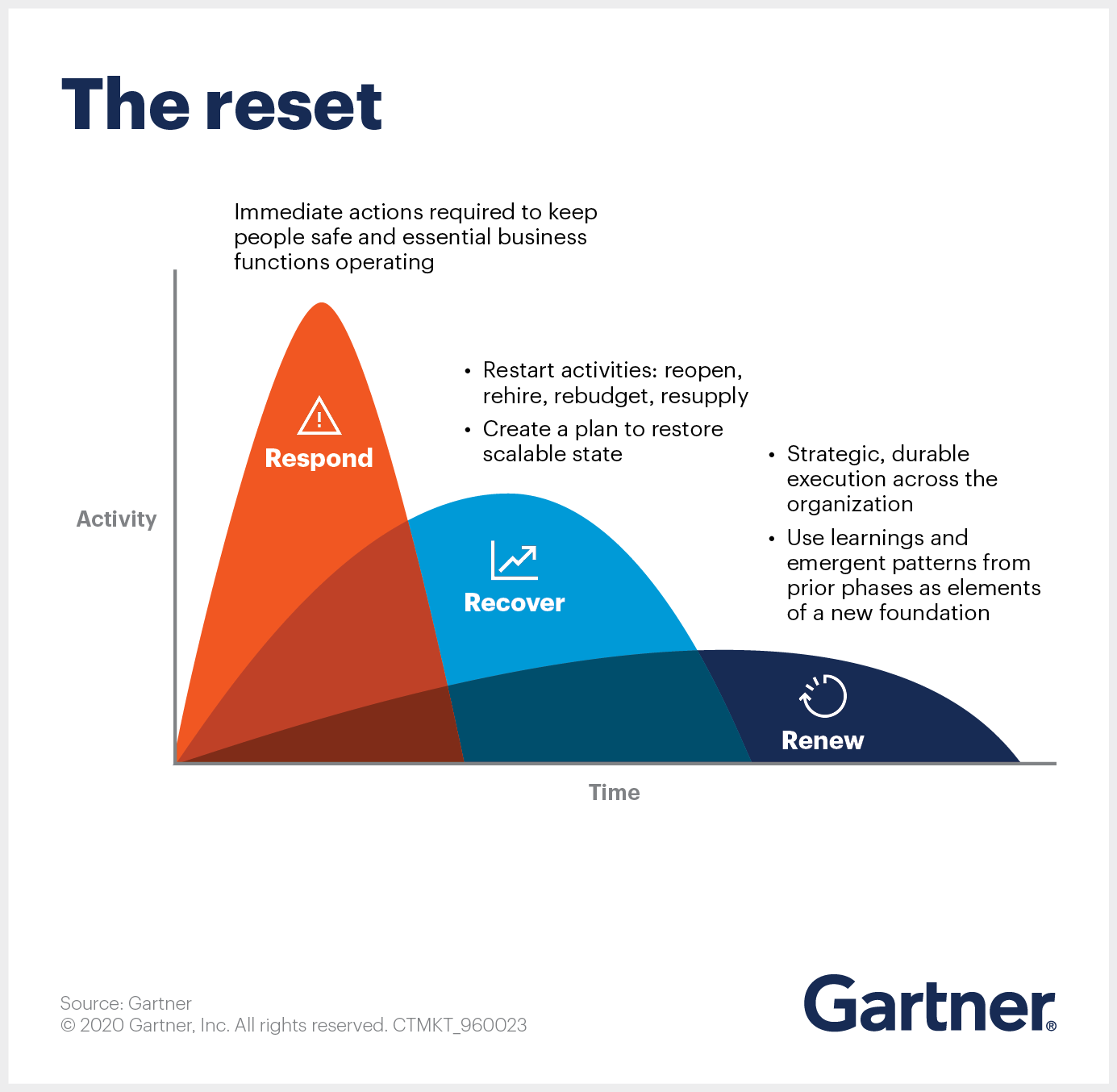 Gartner понимает под «перезагрузкой» три этапа, через которые пройдут руководители во время пандемии. Продолжительность каждого этапа зависит от конкретной страны, отрасли и организации и варьируется по подразделениям, продуктам или услугам. Эти три этапа перезагрузки суть реагирование, восстановление и возобновление бизнеса (см. рис. 1).