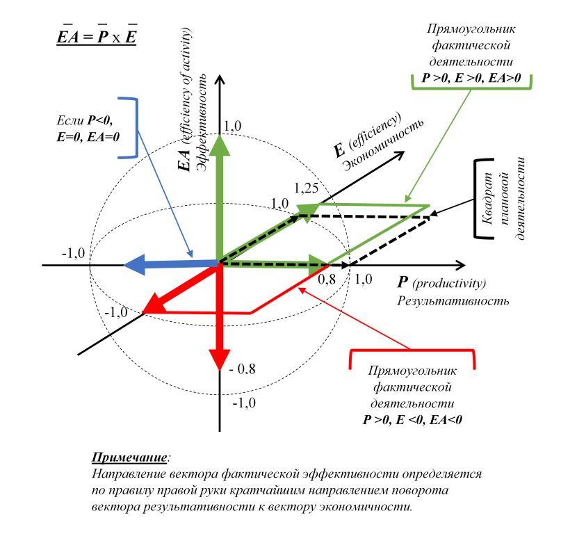 Используя определение и рисунок векторного представления деятельности, формируем достаточно простой и точный образ эффективности как результирующего усилия по ведению деятельности (соответствующее векторному произведению) двух усилий (векторов), формирующих деятельность: результативности и экономичности, направленных на достижение целевого результата экономически оптимального. Тогда эффективность деятельности является вектором ортогональным (перпендикулярным) к плоскости векторов-сомножителей (с направлением по правилу перемножения векторов) и численно равным произведению величин этих векторов (площади прямоугольника, построенного на них).