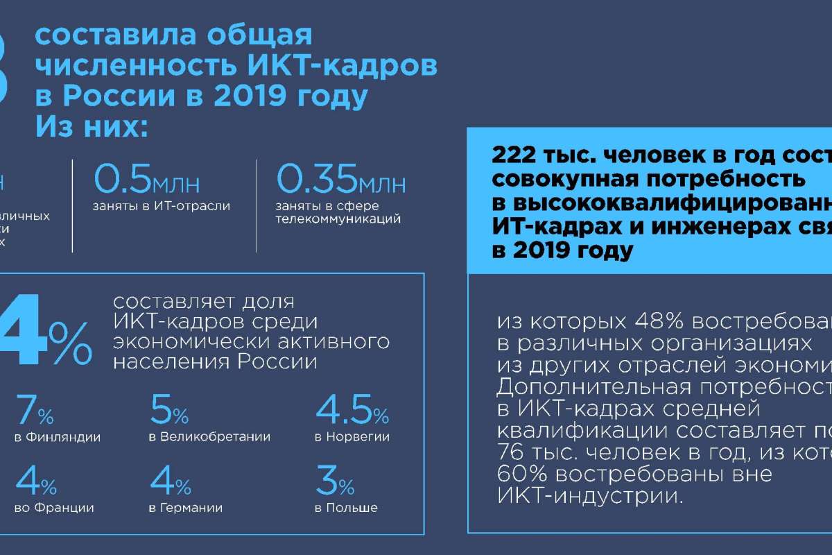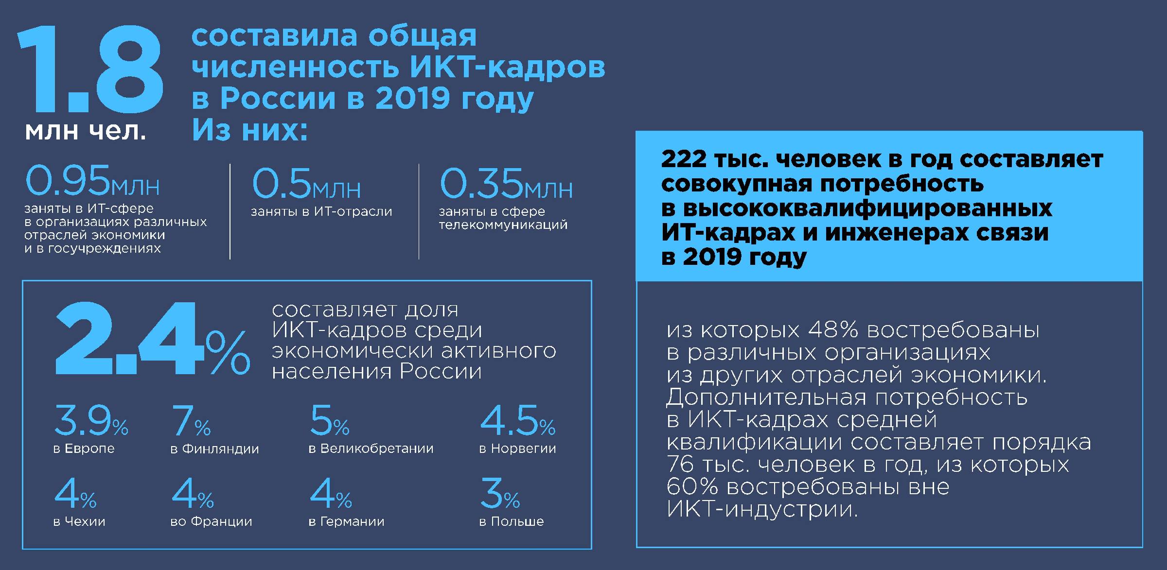 Однако обольщаться этими цифрами преждевременно. Напомним: во время IT-завтрака «Цифровые вызовы новой реальности: кто кому поможет?», организованного в июне этого года совместными усилиями РУССОФТ, РАЭК и РВК, с прискорбием отмечалось , что хотя роль ИКТ-кадров весьма велика, но их доля в экономике России очень мала.