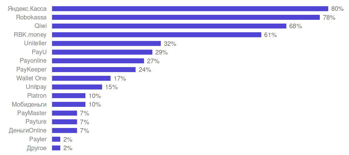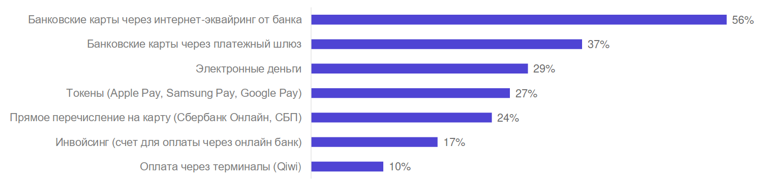 Так или иначе, изученные RBK.money и Data Insight российские B2C-предприятия довольно активно используют онлайновые методы платежей. У 56% респондентов налажен приём банковских карт через Интернет-эквайринг от партнёрского банка, у 37% — через платёжный шлюз, ещё 29% принимают электронные деньги, 27% — цифровые токены (Apple Pay, Samsung Pay, Google Pay) и т. д., вплоть до возможности оплаты через терминалы Qiwi (10%). При этом крупные клиенты предпочитают подключать платёжные методы по отдельности, выбирая для себя наиболее подходящие; тогда как мелкие и средние — через агрегаторов, единым пакетом. Исследователи отмечают, что игрокам российского B2C-рынка плохо знакомы платёжные компании: лишь четыре из них («Яндекс.Деньги», Robokassa, Qiwi, RBK.money) набирают более 60% узнаваемости каждая, тогда как все прочие — не более 30%.