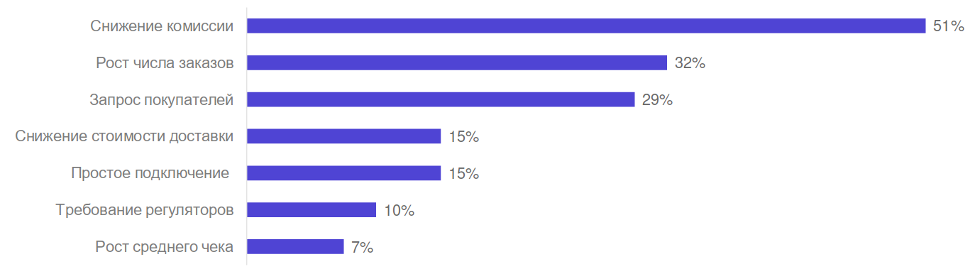 Хотя размер комиссии безусловно имеет значение: высокие аппетиты платёжных провайдеров с очевидностью не устраивают опрошенных бизнесменов. 51% из них признали, что готовы увеличить долю онлайн-платежей сразу же, как только будут снижены комиссии на них. Прочие факторы, способные побудить ориентированный на конечного потребителя российский бизнес к наращиванию доли оплат через Интернет, отстают с заметным отрывом: это рост числа заказов (32%), явно сформулированный запрос со стороны клиентов (29%), снижение стоимости доставки (15%) и т. д.