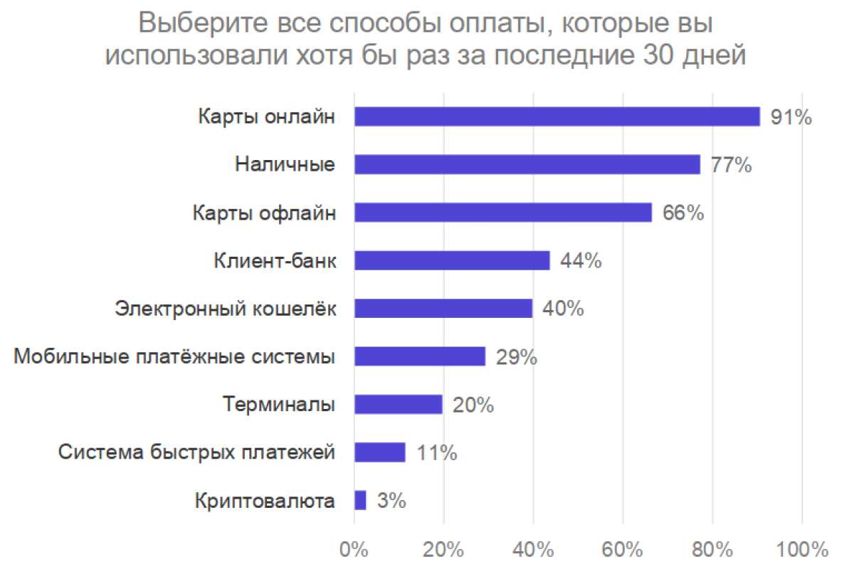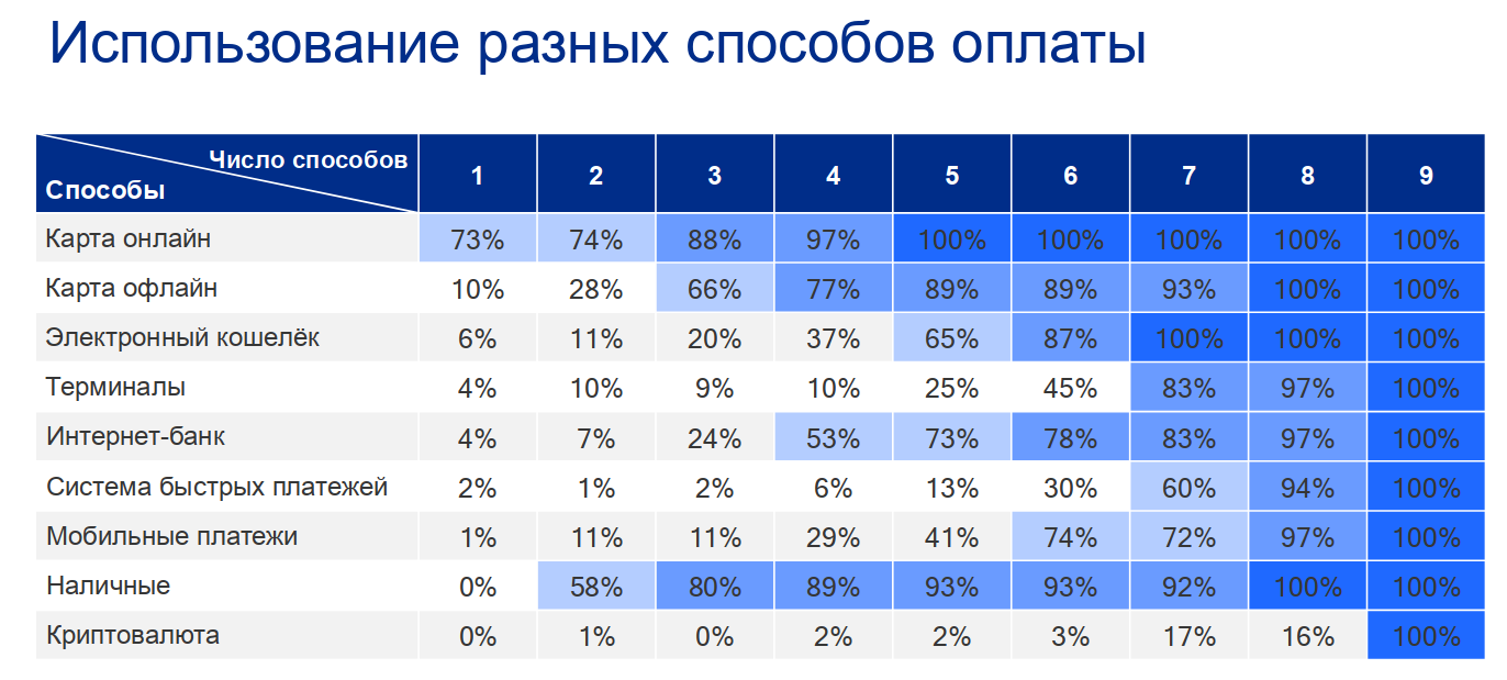 Какие же важнейшие черты в поведении российского потребителя (всего было изучено мнение 1602 человек в возрасте от 18 до 64 лет) выявил опрос? Самая, быть может, яркая среди них, — безусловное предпочтение банковских карт. Всего было рассмотрено 9 способов совершения платежей за покупки онлайн, от оплаты картой на сайте до передачи наличных курьеру и даже такой экзотики, как перечисление на счёт продавца криптовалюты (вообще говоря, до сих пор не признанной законным платёжным средством на территории РФ).