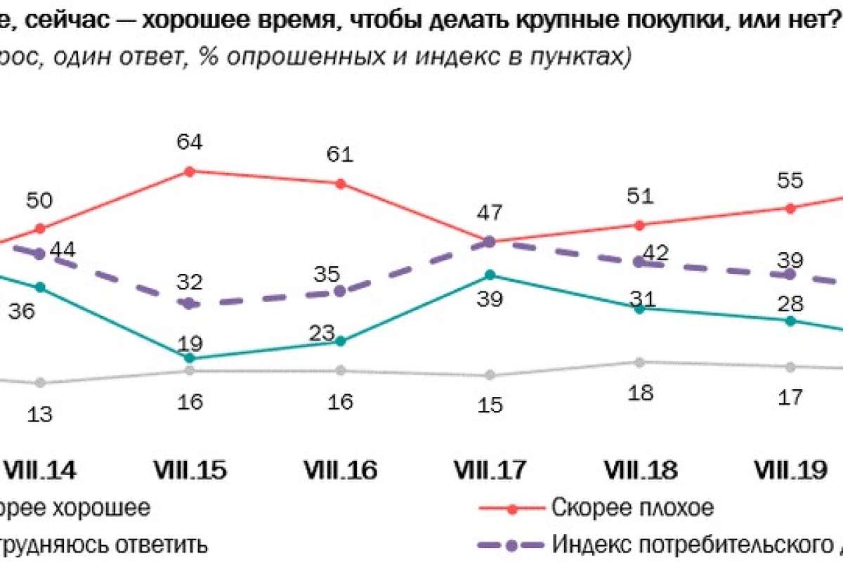 Индекс потребительского доверия показывает, насколько благоприятным россияне считают нынешнее время для совершения крупных покупок. Индекс строится на основе вопроса: «Как Вы думаете, сейчас — хорошее время, чтобы делать крупные покупки, или нет?». Ответу «Скорее хорошее» присваивается коэффициент 0,9, ответу «Скорее плохое» — 0,1, «Затрудняюсь ответить» — 0,5. Индекс измеряется в пунктах и может колебаться в пределах от 10 до 90. Чем выше значение индекса, тем более благоприятным россияне считают текущий момент для крупных приобретений.