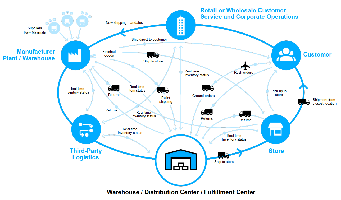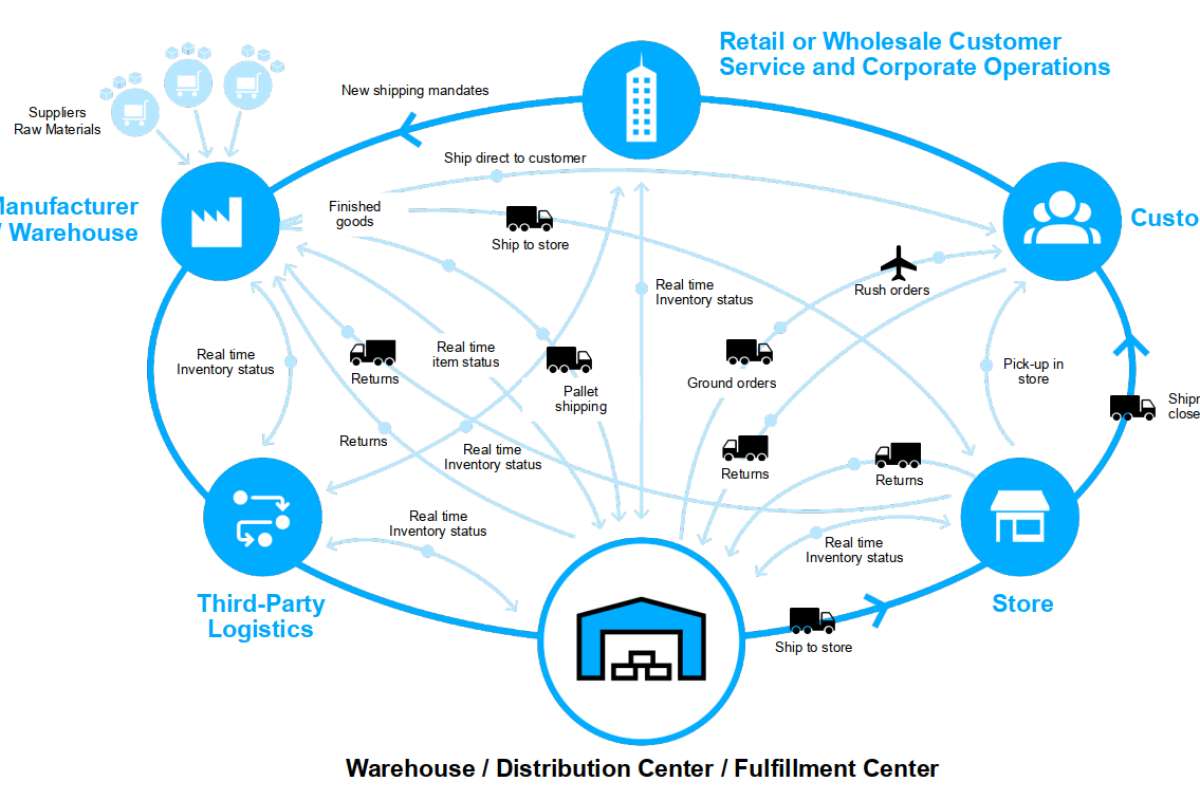 Ещё одним вызовом оказалось кардинальное усложнение цепочки поставок, превращение её фактически в многосвязную сеть (пресловутая омниканальность в действии; см. рис. 1). Ключевые узлы, конечно, остаются прежними: с фабрики розничный товар посредством сторонних логистических компаний поступает на склад, оттуда — в магазин, затем из магазина к потребителю, а от него, если что-то пошло не так, — в сервисный центр для возврата либо обмена. Однако между этими узлами теперь утвердилось множество прямых связей: потребитель волен заказать товар прямо с фабрики, если она располагает собственной Интернет-витриной либо сотрудничает в маркетплейсом; потребитель может заказать спешную целевую доставку непосредственно со склада, минуя магазин; возврат товара порой проще осуществлять на склад, а не в сервисный центр (экономя средства и время на детальное выяснение причин неисправности) и т. п.