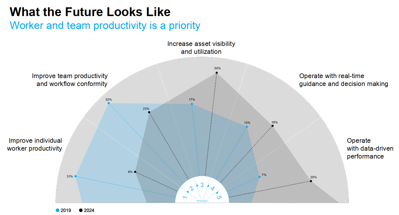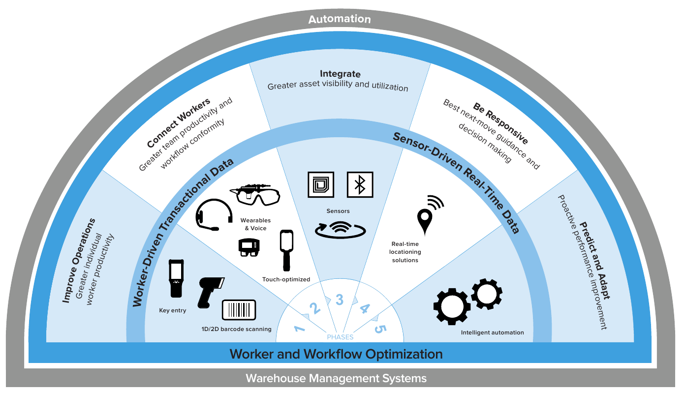 Zebra Technologies формулирует достаточно чёткое видение перспектив автоматизации складского хозяйства, нужда в которой в посткоронавирусном мире с очевидностью будет неуклонно возрастать. С 2019 по 2024 г., согласно уже упомянутому исследованию 2024 Warehousing Vision Study, цифровая трансформация склада должна происходить в пять этапов (см. рис. 2). Для первых двух, самых насущных, приоритетами станут повышение производительности труда каждого сотрудника в отдельности, а также повышение эффективности действий команды как целого и отладка обновлённых рабочих процедур. Последующие три этапа, отнесённые уже на среднесрочную перспективу, — это всё более полное понимание и использование работниками возможностей новых цифровых инструментов, приучение к действиям в среде, где умная система в режиме реального времени отслеживает действия людей и выдаёт им рекомендации, а также высокопроизводительная деятельность, направляемая потоками данных.
