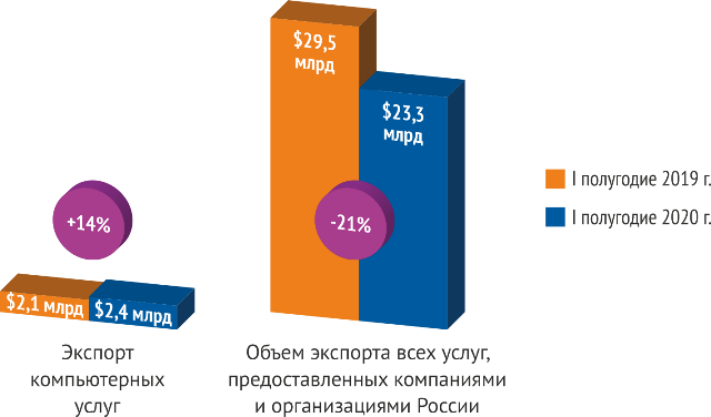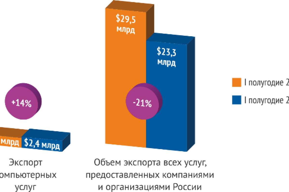 Рост компьютерных услуг в I полугодии 2020 г. будет выглядеть еще более впечатляющим, на фоне всего российского экспорта услуг. Их объем за этот же период сократился на 21% до 23,2 млрд долл. Подобное значительное падение произошло из-за карантинных мер и сокращения мировой экономики. Данные факторы повлияли и на экспорт компьютерных услуг, поскольку в I кв. он увеличился на 24%, а во II кв. — только на 5,6%. Произошло существенное сокращение темпов роста, но экспортные доходы в компьютерной сфере все же продолжали расти.