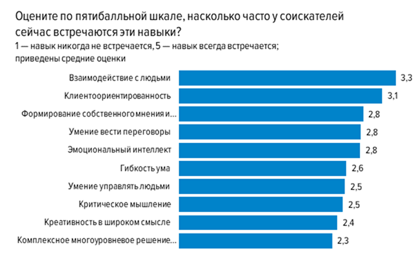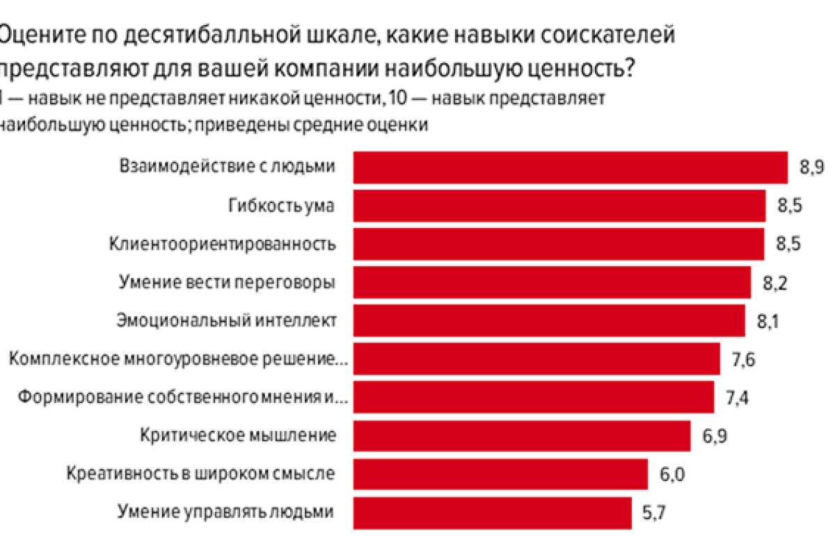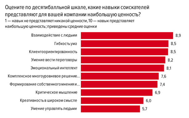 Все навыки получили среднюю оценку выше 5 по десятибалльной шкале. Наиболее значимым навыком, по мнению российских работодателей, является навык взаимодействия с людьми — он получил почти 9 баллов из 10. Гибкость ума и клиентоориентированность делят между собой второе место с 8,5 баллами. Последнюю строчку с 5,7 средним баллом занимает умение управлять людьми: важный навык, но всё-таки более специфический, для управленческих позиций.