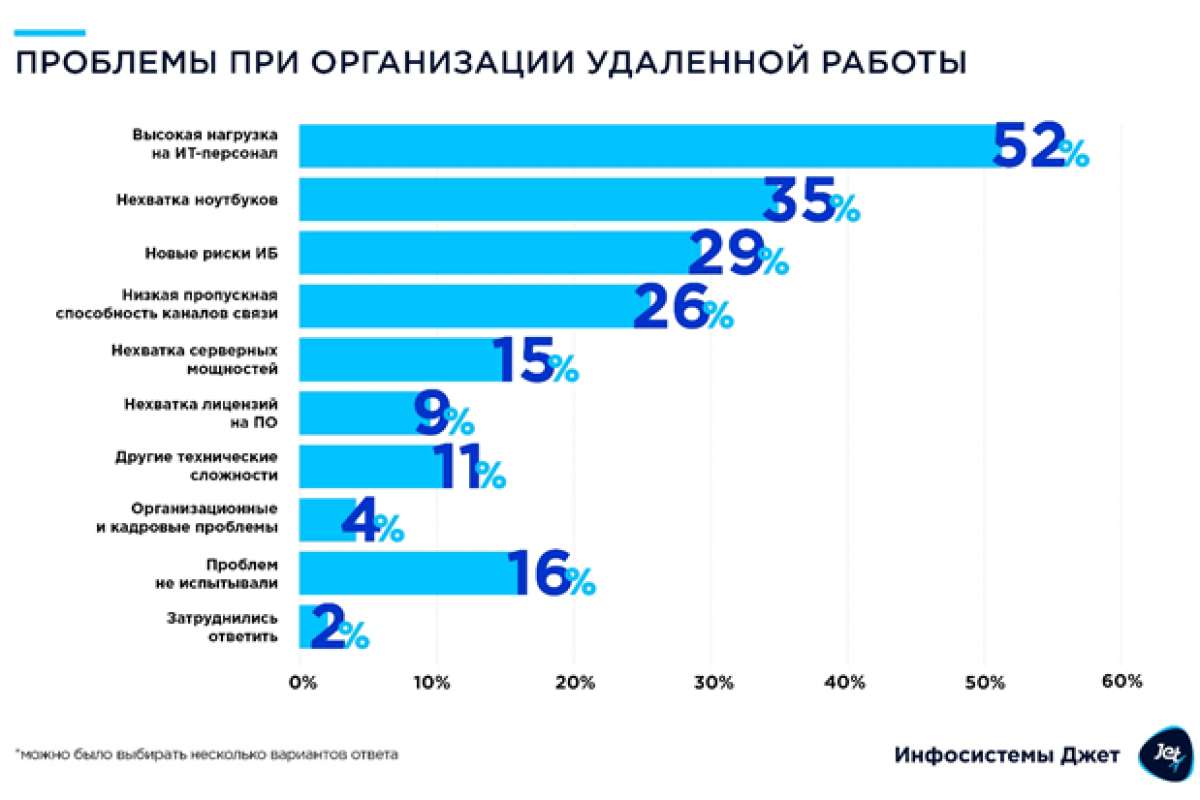 Быстро перестроиться под требования новой реальности во время карантина стало серьезным вызовом. В основном респонденты сетовали на экспоненциальный рост нагрузки на ИТ-персонал — это отметило 52% из них. Вторую по значимости сложность создавал недостаток устройств для работы из дома. Почти треть респондентов отметила проблемы с информационной безопасностью. Также существенная доля компаний столкнулась с недостаточной пропускной способностью каналов связи (26%) и нехваткой серверных мощностей (15%). Лишь 16% респондентов не коснулись какие-либо проблемы. (Рис. 1)