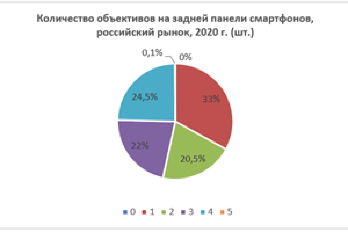 По итогам 2020 года на российском рынке наибольший прирост продемонстрировали смартфоны с фотомодулем из четырёх камер, доля которых за год увеличилась с 2% до 24,5%. Доля смартфонов с тройной основной камерой достигла 22% (+8 п.п.). Ещё 20,5% пришлось на устройства с двумя объективами и 33% на модели с одним объективом (-16 п.п.). (Рис. 1 и 2)
