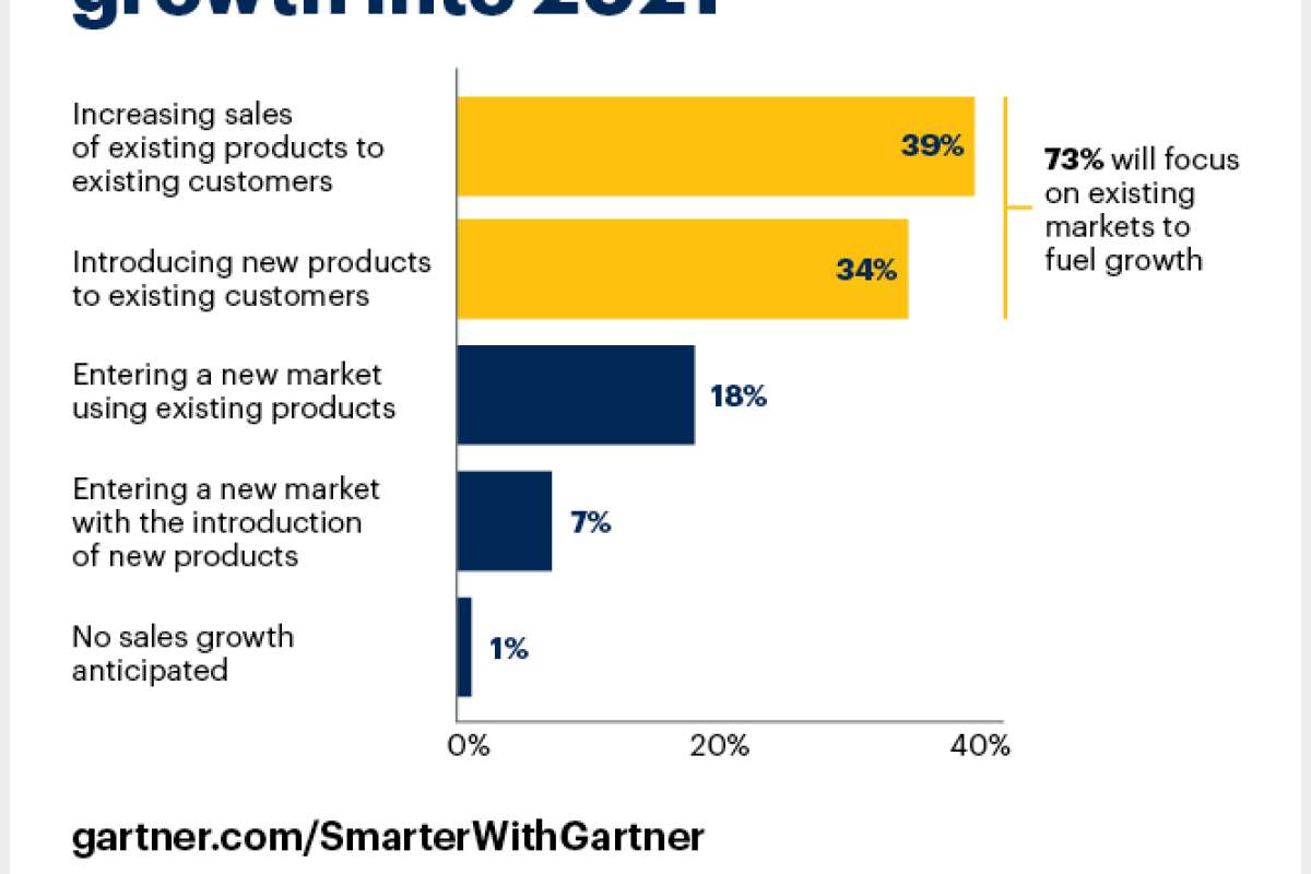 Согласно недавнему опросу Gartner, 73% директоров по маркетингу рассчитывают, что уже имеющиеся клиенты обеспечат рост продаж в 2021 году, и не планируют выходить на новые рынки. Как показало впервые проведенное исследование стратегических приоритетов директоров по маркетингу, 39% опрошенных планируют увеличить продажи имеющихся продуктов своим существующим клиентам в 2021 году, а 34% намерены предложить новые продукты им же (см. рис. 1).