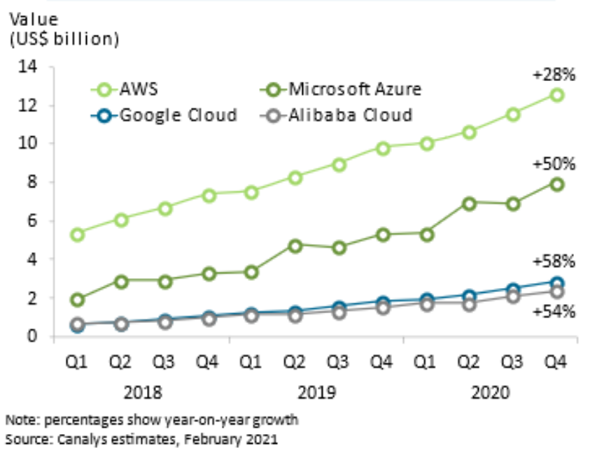 Выручка инфраструктурных услуг, предоставляемых AWS, и прежде весьма немалая, в IV кв. 2020 г. выросла на 28% в годовом исчислении. Лидеру рынка расти высокими темпами сложнее всего — и эксперты Canalys отмечают, что AWS прилагает особенно заметные усилия для продвижения своих сервисов в канале. Эта служба активно инвестирует в глобальную партнёрскую экосистему, поддерживает независимых поставщиков ПО (чтобы те предлагали свои продукты в том числе как облачные сервисы), развивает партнёрские программы на вертикальных рынках, особое внимание уделяет привлечению дистрибьюторов для продажи облачных услуг заказчикам из СМБ, а также адаптирует свои продукты для использования в гибридных облаках.