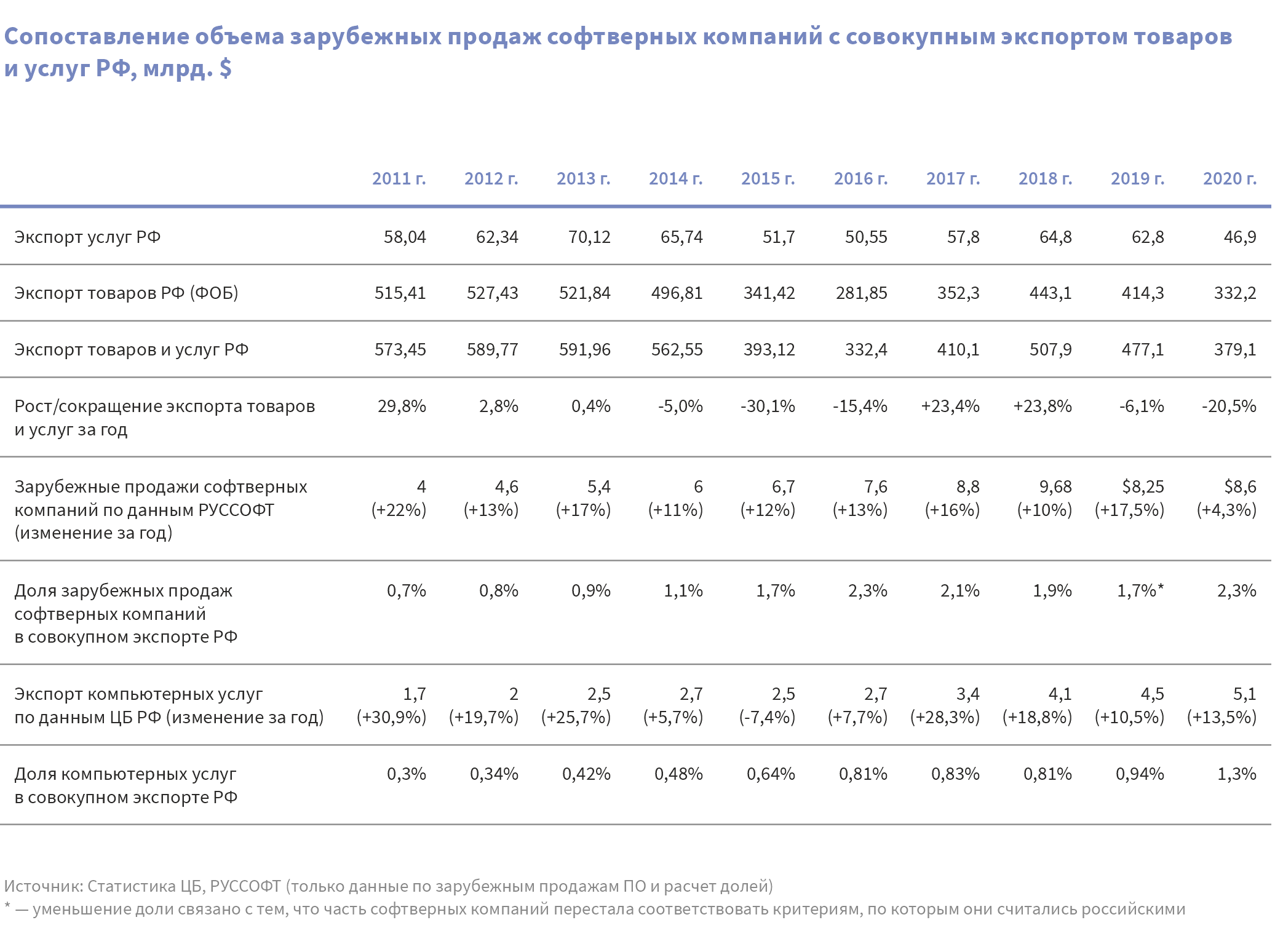 Доля зарубежные продаж софтверных компаний в экспорте товаров и услуг из России в 2020 г. достигла рекордной величины — 2,3%