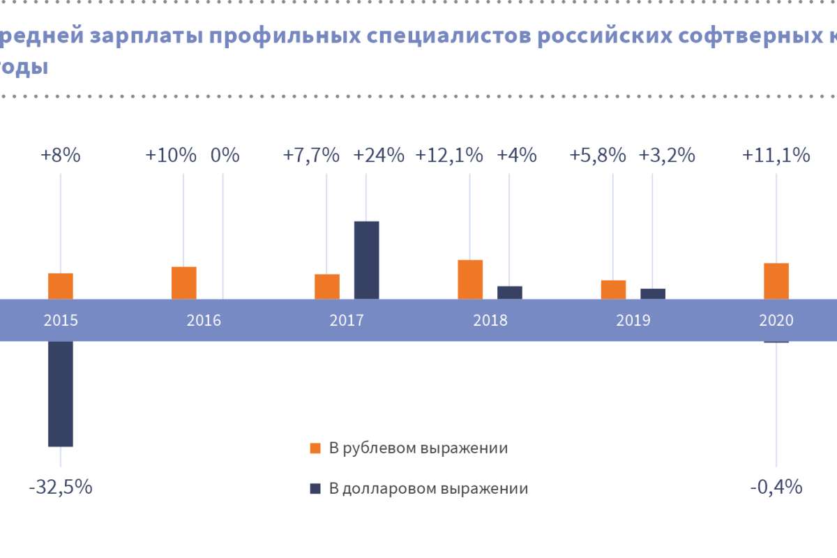 Если рассматривать 7 последних лет, то средняя зарплата профильных сотрудников российских софтверных компаний в рублях выросла на 88% и снизилась на 16% в долларах. Однако нельзя сказать, что выезд за рубеж стал однозначно более выгодным делом для разработчиков ПО.