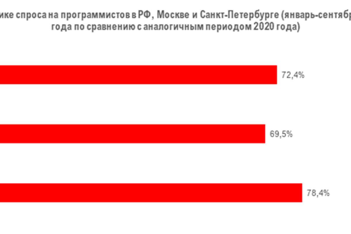На Москву в 2021 году приходится 38% размещенных вакансий для программистов, каждая шестая — на Санкт-Петербург. Всего за период с января по сентябрь 2021 г. в России размещено 224,5 тыс. вакансий для программистов. Наиболее заметно спрос на программистов вырос в Республике Карелия, Оренбургской области и Смоленской области — в среднем в два раза.