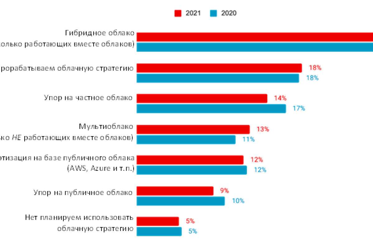 Примечательно, что 18% респондентов все еще прорабатывают свою облачную стратегию, а у 5% ее нет вовсе. Со времени прошлого отчета эти цифры не изменились, так что в следующем году мы будем внимательно следить за признаками роста.