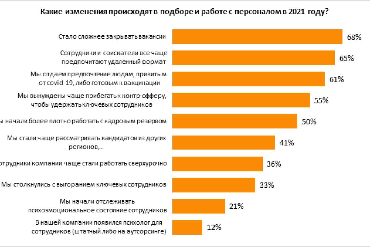 Ряд заметных изменений связан с поведением и самочувствием персонала. Так, 36% компаний признали, что их сотрудники чаще стали работать сверхурочно. Во-первых, сказываются продолжительные больничные из-за коронавируса, во-вторых, влияет длительное закрытие новых позиций. Когда людей не хватает, некоторым сотрудникам приходится буквально работать за двоих и брать на себя функционал своих коллег. 33% компаний на этом фоне столкнулись с выгоранием ключевых сотрудников. Некоторые работодатели начали отслеживать психоэмоциональное состояние персонала (21%), а также обзавелись психологами (12%).